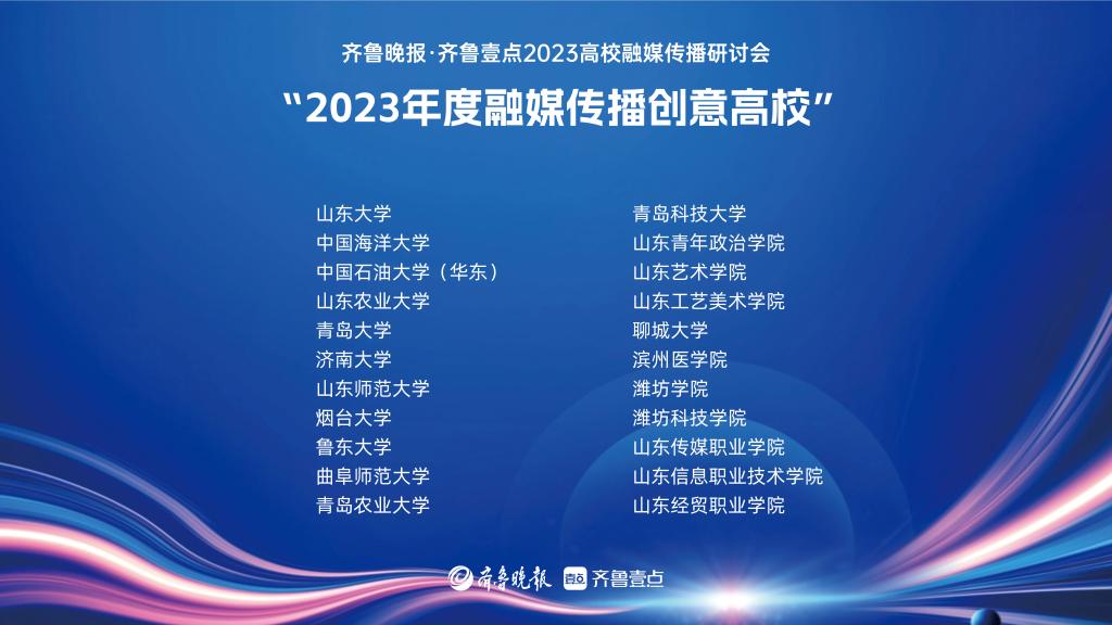11月29日,齐鲁晚报·齐鲁壹点与山东省新闻摄影学会联合主办山东高校融媒传播交流会暨第五届“寻找山东最美大学”微视频/摄影大赛颁奖典礼。我校荣获“2023年度融媒传播创意高校”奖和优秀组织奖。我校学生作品获微视频类作品奖项一等奖1件,二等奖3件,三等奖1件,佳作奖3件,最佳视觉效果奖2件,优质网络人气奖2件;摄影类一等奖1件,二等奖2件,三等奖2件,佳作奖1件,优质网络人气奖1件。我校教师获齐鲁晚报2023年优秀通讯员。
