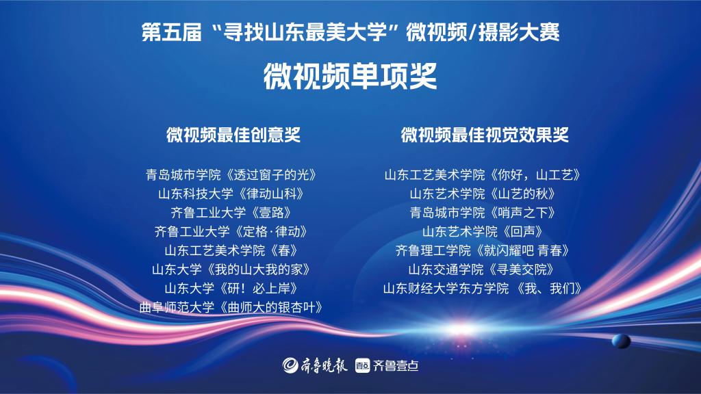 据悉“寻找山东最美大学”微视频/摄影大赛是齐鲁晚报・齐鲁壹点自2019年开始发起的品牌活动。活动的初衷是展现山东高校风采,展示山东大学生的青春与活力,促进美丽文明校园建设。10月11日,第五届“寻找山东最美大学”微视频/摄影大赛正式启动,由齐鲁晚报·齐鲁壹点联合山东省新闻摄影学会共同举办,本次大赛主题是“律动校园”。大赛启动以来,全省高校学生积极参与,大赛组委会共收到各种微视频以及摄影作品1300余件,经过初审、作品展示、专家评审、网络投票,最终91件微视频、87件摄影作品获得专家评审奖,15件作品获专家评审单项奖。另有20件视频作品、20件摄影作品获得网络人气奖。