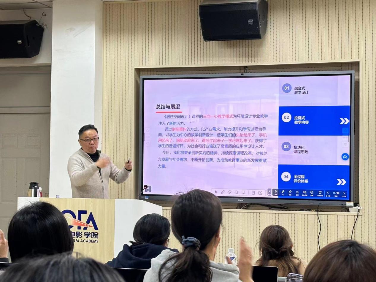 王大海从课程概述、学情分析、创新思路、具体举措以及教学成效等方面分享了自己主持的山东省一流本科课程——《居住空间设计》课程,讲述了“三向一心”的教学模式、“145”融合式教学设计、“互燃式的讲授与交流、互怼式的思考与辩论、互助式的应用与实践”的教学改革和课程辐射效应。他强调,设计专业的课程建设要以产业需求为导向,重构拉链式教学内容,引入实战项目,实施项目化教学;以提升能力为导向,整合多元化教学资源,融入模块化课程思政,培养学生“三多三思”思维模式;以学习过程为导向, 建立“三维全过程评价体系”。