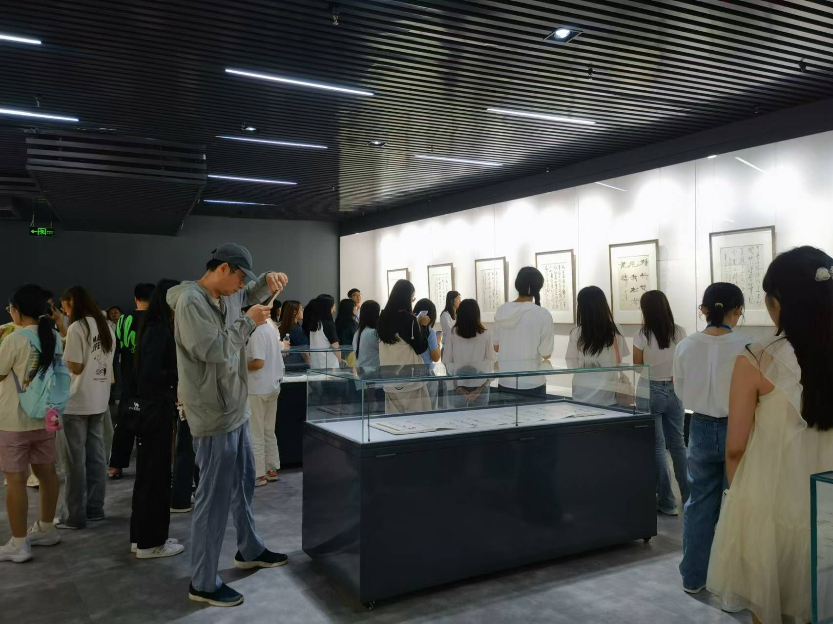 翰墨云章志愿者服务团队12名志愿者担任向导和讲解员,带领他们先后参观了书法艺术陈列馆、山东汉画像石艺术馆和书法学院2024届毕业展。参观过程中,双方教师在书法教育、学生思想政治教育和就业等方面开展深入交流和探讨。