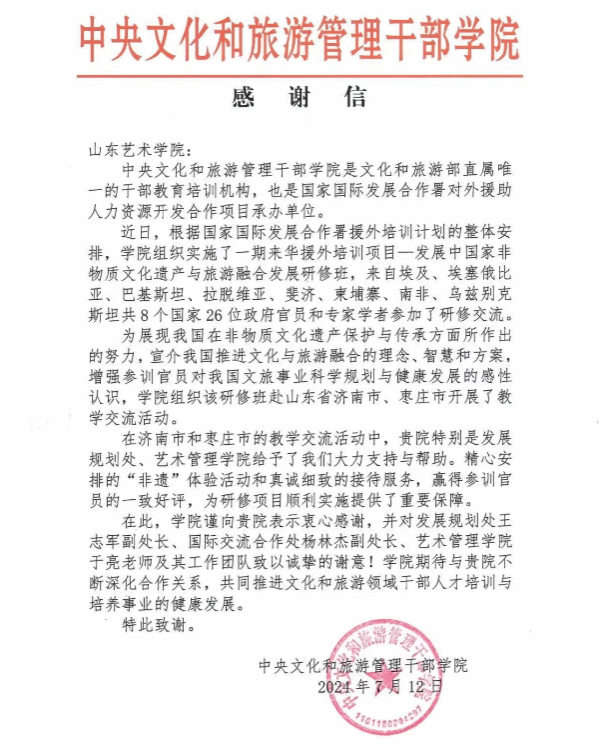 感谢信中提到,中央文化和旅游管理干部学院组织实施了一期来华援外培训项目—发展中国家非物质文化遗产与旅游融合发展研修班,组织该研修班赴济南市、枣庄市开展了教学交流活动。我校特别是发展规划处、艺术管理学院给予了大力支持与帮助。精心安排的“非遗”体验活动和真诚细致的接待服务,赢得参训官员的一致好评,为研修项目顺利实施提供了重要保障。中央文化和旅游管理干部学院向我校表示衷心感谢,并对发展规划处王志军副处长、国际交流合作处杨林杰副处长、艺术管理学院于亮老师及其工作团队致以诚挚的谢意。