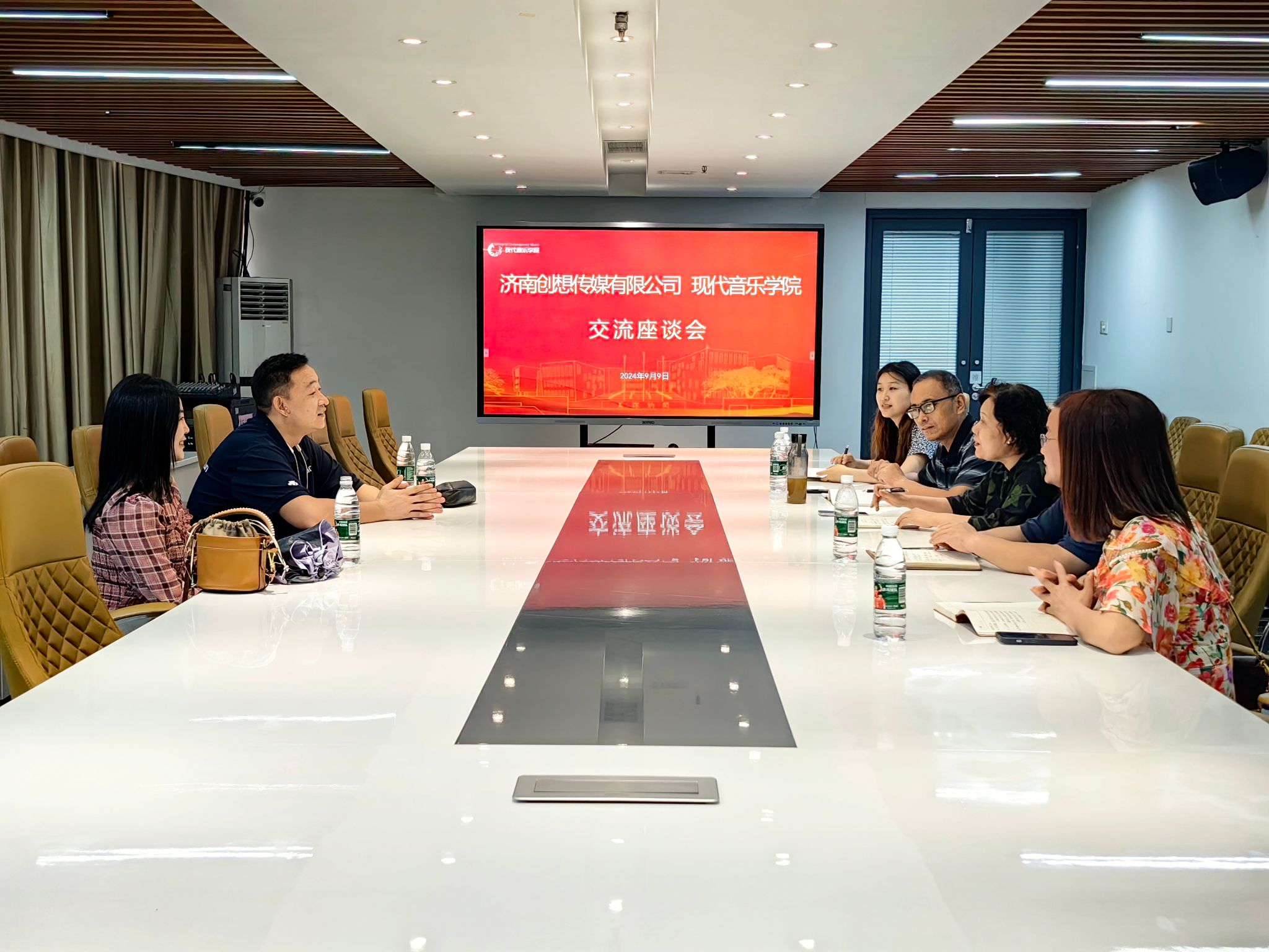 9月9日下午,现代音乐学院与济南创想传媒有限公司在文东校区就进一步拓宽毕业生就业渠道、加强校企合作等进行座谈交流。济南创想传媒有限公司董事长许炳青,现代音乐学院党政班子成员和教师代表参加座谈。