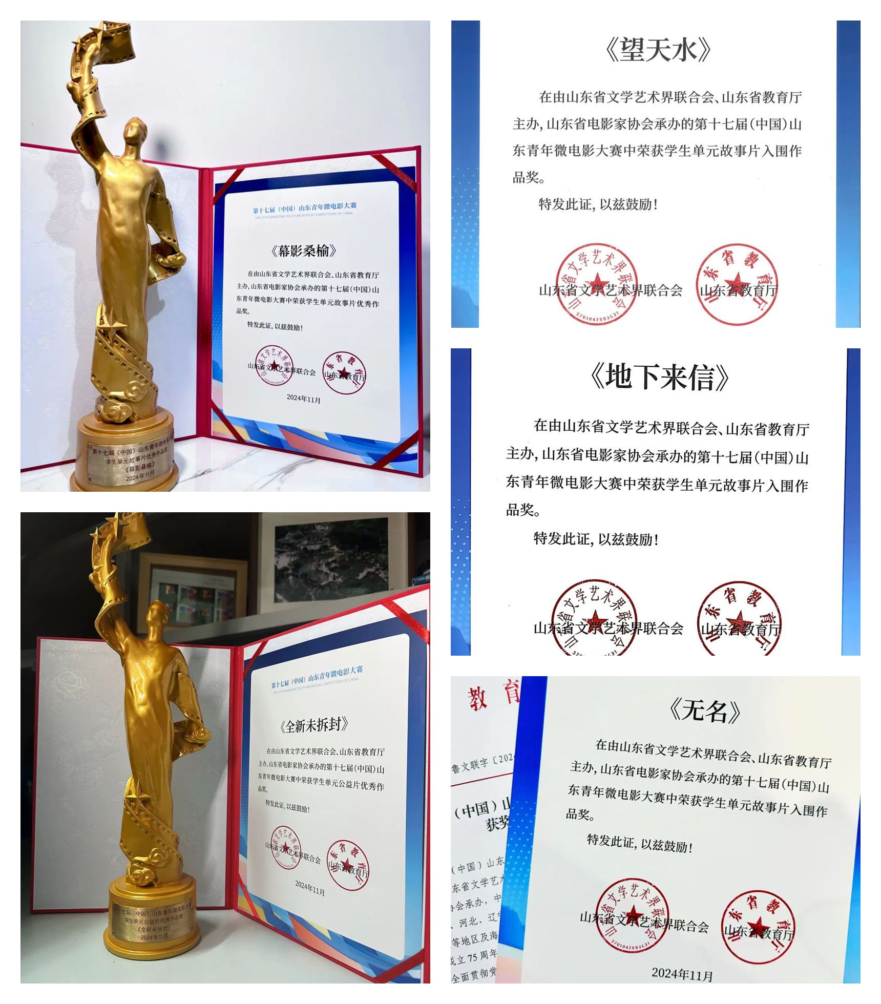 第十七届(中国)山东青年微电影大赛落幕,我校获得各类奖项8项,其中优秀作品奖2项,分别是故事片(学生单元)《幕影桑榆》、公益片(学生单元)《全新未拆封》;入围作品奖3项,分别是故事片(学生单元)《望天水》《地下来信》《无名》;电影学院外聘硕士生导师王坪、教师孙非分别获得单项奖中优秀指导教师奖;学校获得优秀组织奖。