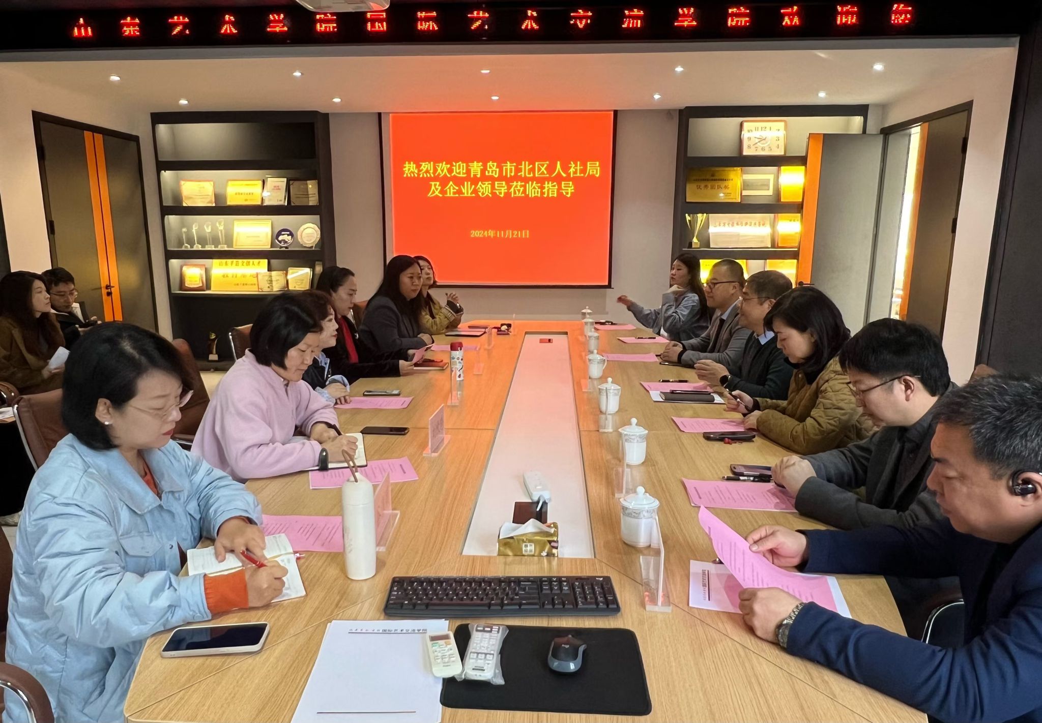 国际艺术交流学院党总支负责人介绍了学院办学历史、人才培养、专业特色、2025届毕业生整体情况和求职意向等。青岛市市北区公共就业和人才服务中心副主任陈硕介绍了市北区人才政策及相关企业的用人需求。双方就推进校企合作进行了充分沟通。