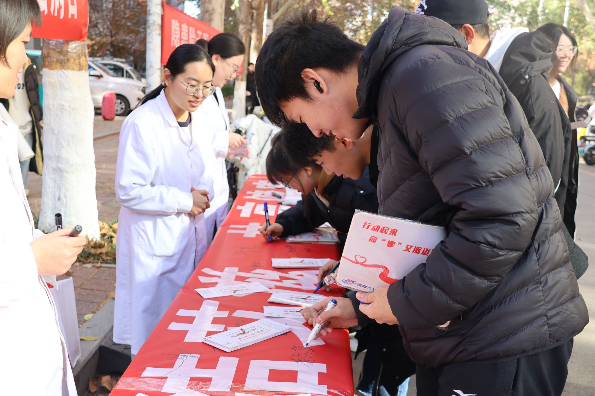 学校后勤管理处保健科医务人员及学生志愿者向师生发放《珍爱生命,青春零艾滋》和《行动起来,向“零”艾滋迈进》等大学生预防艾滋病宣传手册,热情讲解艾滋病防治知识。现场师生积极参与,纷纷在条幅上签下自己的姓名,以示合力共抗艾滋病的决心。