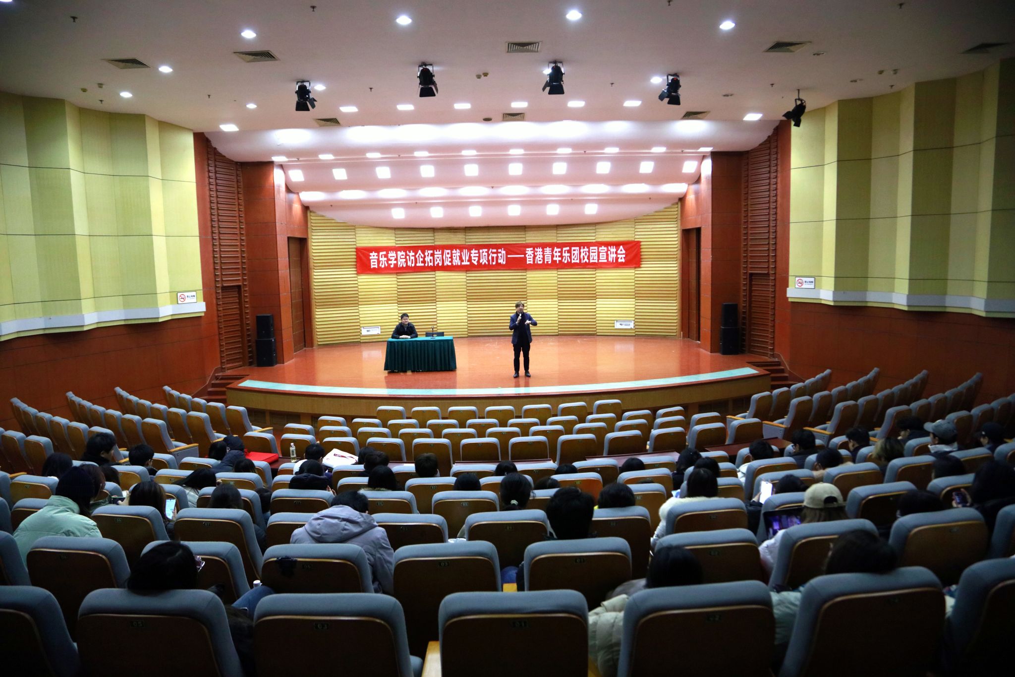 11月27日,香港青年乐团校园宣讲会在文东校区举办。香港青年乐团主席、香港青年音乐家联会会长张文濠,香港青年乐团总干事、香港青年音乐家联会总干事张宇,音乐学院师生代表近200人参加活动。