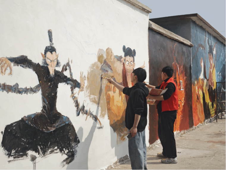 美术学院创新“党建+艺术”模式,结合学生专业特点和地方文化特色,以活化传统文化为切口,与当下国潮画风融合,在村口巷道创作了8组传统脸谱墙绘,绘制了6幅《哪吒》主题墙绘,共建了乡村文化长廊,为古村落注入了青春活力,