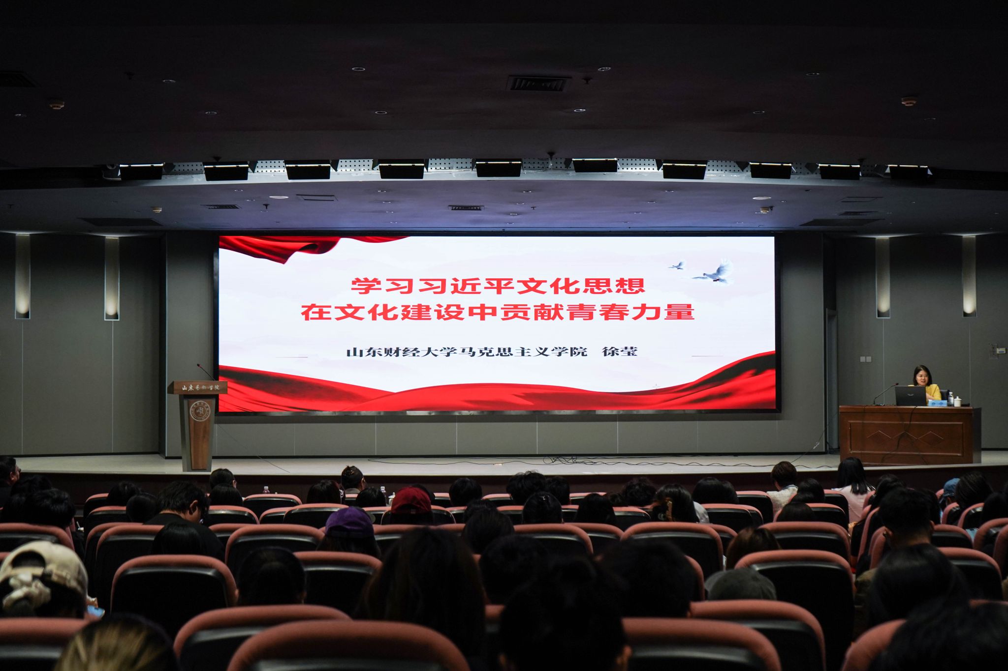 培训期间,山东省“学思想 悟道理 用方法”主题宣讲团成员、山东财经大学马克思主义学院院长、教授徐莹作《学习习近平文化思想 在文化建设中贡献青春力量》专题授课。徐莹从习近平文化思想的理论渊源和形成发展、习近平文化思想的战略地位和核心要义、在铸就社会主义文化新辉煌中贡献力量三个方面全面梳理了习近平文化思想的形成过程,深刻阐明了习近平文化思想的战略地位,对广大学员提出殷切希望。