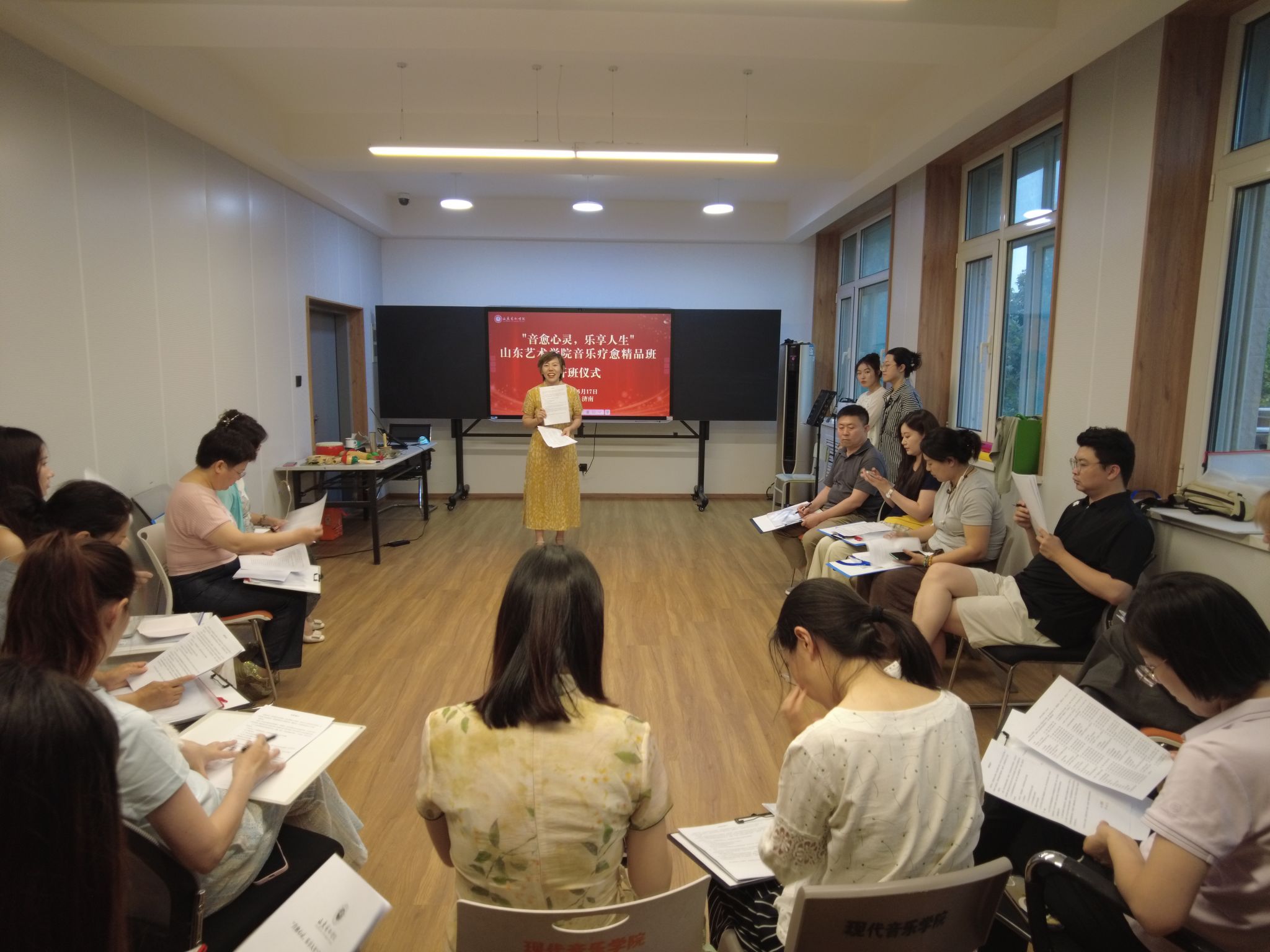 6月17日,山东艺术学院“音愈心灵,乐享人生”音乐疗愈精品班开班仪式在文东校区举行,艺术教育集团负责人、主讲教师团队及社会参培学员参加。