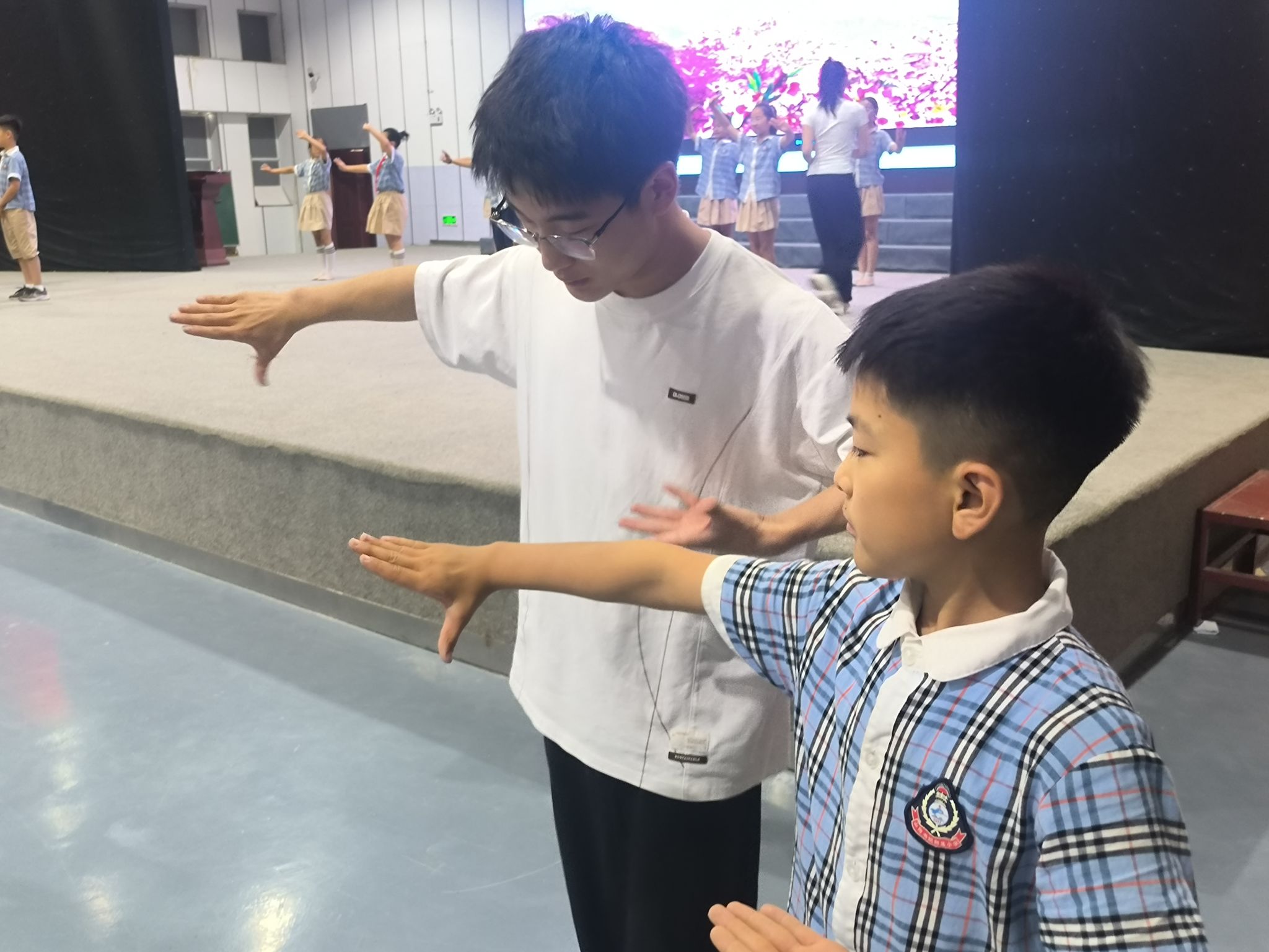 青年教师逄瑷嘉带领6名学生志愿者指导金乡县实验小学排练原创京剧《京韵古诗·四季》。师生提前熟悉节目内容,根据生旦净丑行当分组教学,从基础唱腔到身段造型,在原有基础上耐心拆解、反复示范,使孩子们对剧目有了更全面的理解和明显的提升。