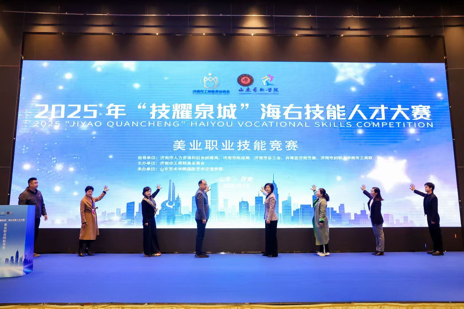 10月18日,2025“技耀泉城 ”海右技能人才大赛—美业职业技能竞赛在济南举办。济南市工商联主席、济南总商会会长刘佳、济南市人力资源和社会保障局职业能力建设处处长张明、济南团市委统战和社会联络部副部长胡春燕、济南市妇联发展部副部长张玲玲、济南市人力资源和社会保障局职业能力建设处四级调研员李飞、山东大智教育集团股份有限公司党委书记王现芹、济南市工商联美业商会会长马海明出席开幕式。我校国际艺术交流学院党总支负责人在开幕式上发言。
