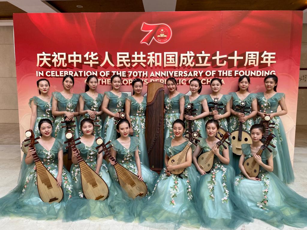 招待会文艺演出中,音乐学院同学以快闪的形式表演的歌曲《我和我的祖国》,女子弹拨乐团演奏的《沂蒙踏春》等节目,展现了我校学生良好的艺术修养与水平,表达了对祖国母亲70华诞的美好祝愿,受到一致好评。