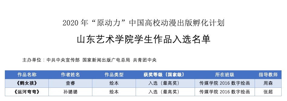 近日,在中宣部主持筛选,中宣部、国家新闻出版广电总局、共青团中央主办的“原动力”中国高校动漫出版孵化计划中,我校传媒学院学生查睿创作的作品《鹤女孩》、孙璐璐创作的作品《运河弯弯》成功入选。