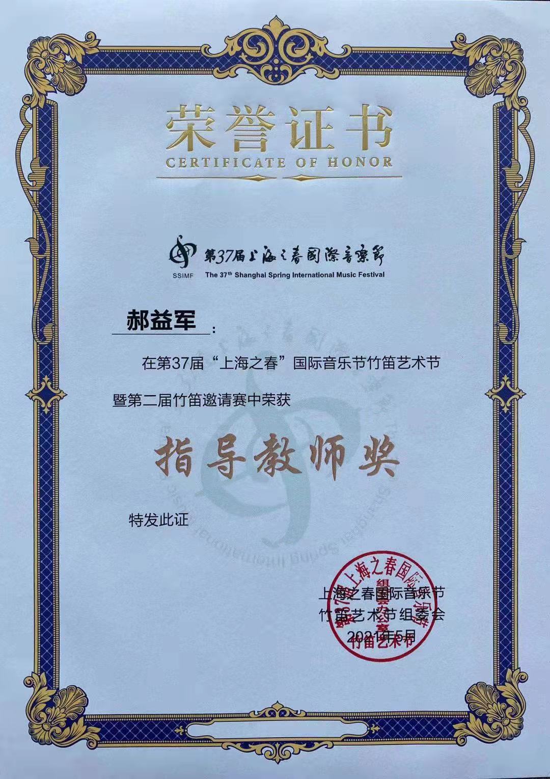 5月2日,由上海音乐家协会、上海音乐学院主办,上海音乐家协会竹笛专业委员会承办的第37届“上海之春”国际音乐节竹笛艺术节暨第二届竹笛邀请赛决赛成绩揭晓。山东艺术学院荣获“优秀组织奖”,音乐学院2019级硕士研究生汤劭元荣获青年专业组铜奖,2018级本科生孔子涵荣获青年专业组演奏奖,音乐学院郝益军教授荣获“指导教师奖”。