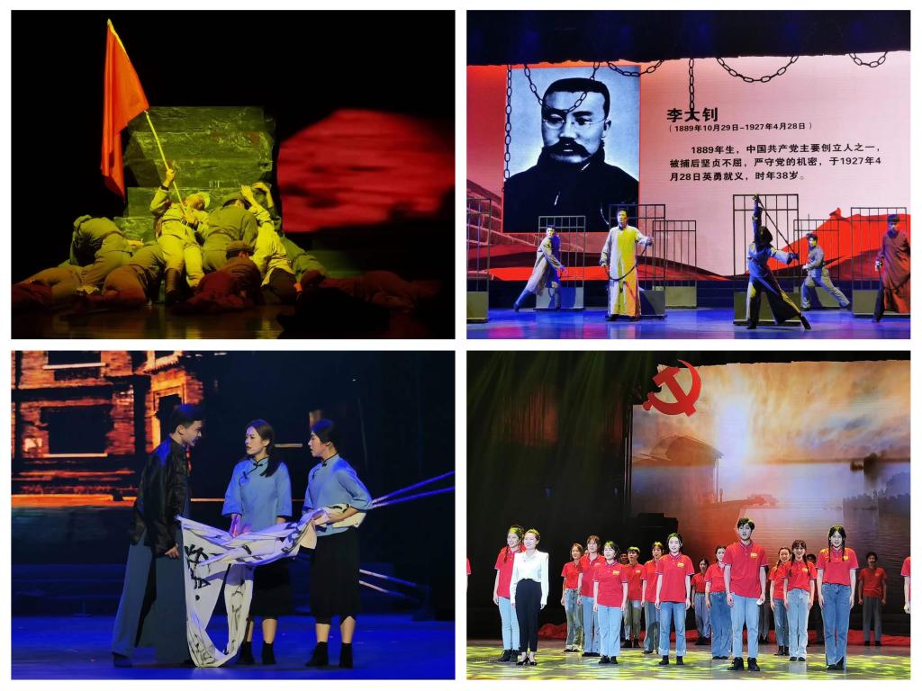据悉,作为向建党100周年的献礼作品,原创音乐剧《百年旗帜》已于7月1日在我校成功首演。该剧编剧、音乐总监、导演、舞蹈编导等主创团队均为我校中青年骨干教师,演员和作曲全部为现代音乐学院学生。创作过程中,主创团队深入学习贯彻习近平总书记关于党史的重要论述,结合正在开展的党史学习教育、课程思政建设,积极展开调研,走访多处革命圣地,反复打磨,最终将作品呈现在舞台上。该剧曾入选山东省文化和旅游厅“百年征程时代华章”庆祝建党100周年山东省优秀剧目展演,并于10月荣获北京大学主办的第六届“音乐剧学院奖”优秀指导团队奖。