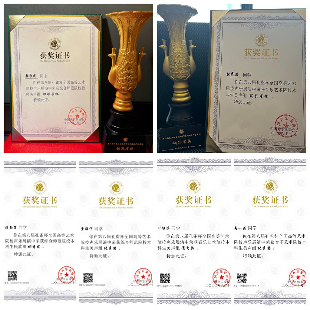 8月8日至15日,第八届孔雀杯高等艺术院校声乐展演在宁波大学举行。我校师生在比赛中获得佳绩,其中,现代音乐学院青年教师张学成博士荣获综合师范院校教师美声组“银孔雀杯”第一名;音乐学院2021级本科生张家浩荣获音乐艺术院校本科生美声组“铜孔雀杯”;音乐学院本科生田雅淇、吴一诺,现代音乐学院本科生胡韵笛、董海宁荣获“优秀奖”;音乐学院7名学生、现代音乐学院8名学生荣获“入围奖”。