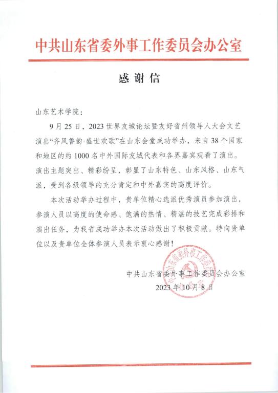 10月8日,我校收到中共山东省委外事工作委员会办公室发来的感谢信,信中指出,我校师生参加2023世界友城论坛暨友好省州领导人大会文艺演出,以高度的使命感、饱满的热情、精湛的技艺完成彩排和演出任务,为活动成功举办作出了贡献。