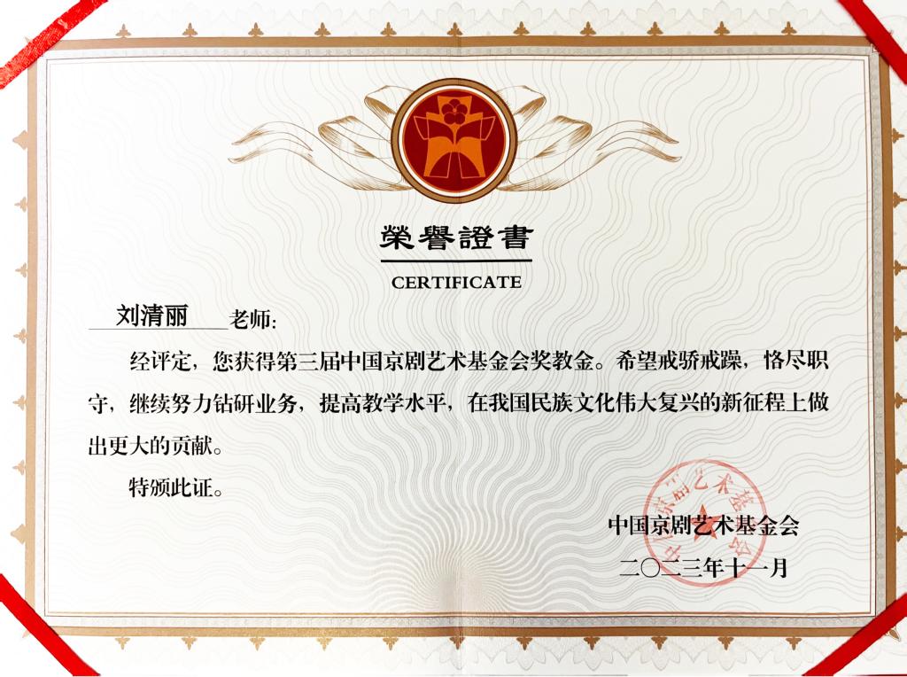 近日,由中国京剧艺术基金会主办,吉林艺术学院承办的第十届艺术院校京剧专业中青年教师教学交流展示暨第三届奖教金颁奖活动在吉林长春举办。我校戏曲学院青年教师刘清丽荣获第三届中国京剧艺术基金会奖教金。