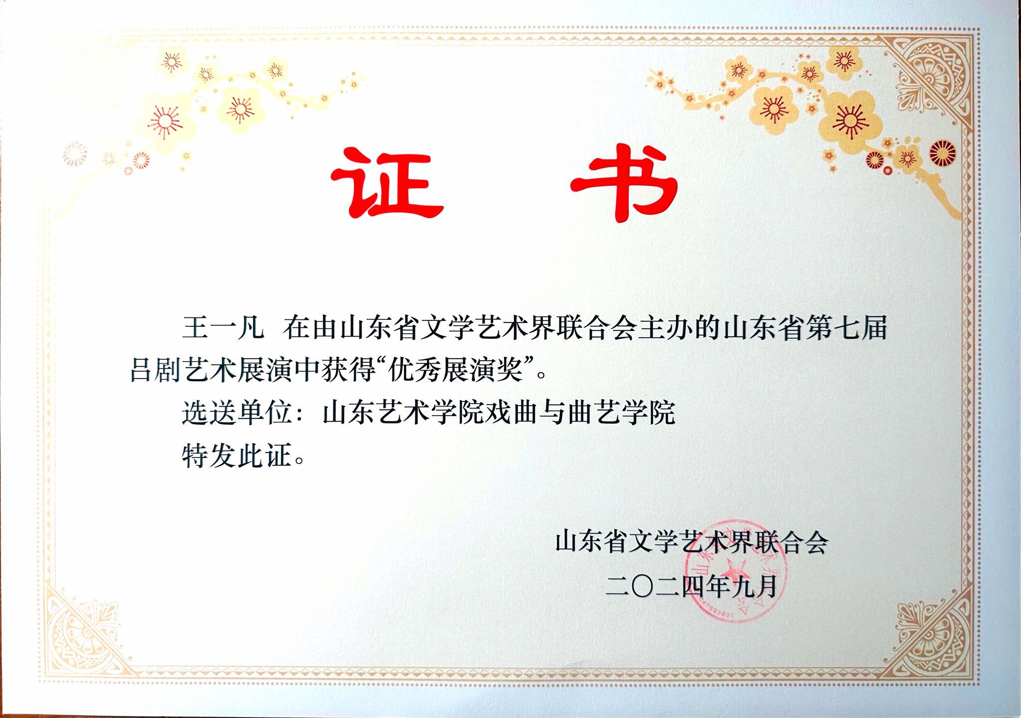 近日,山东省第七届吕剧艺术展演在东营市广饶县举行。我校戏曲与曲艺学院青年教师王一凡荣获“优秀展演奖”。