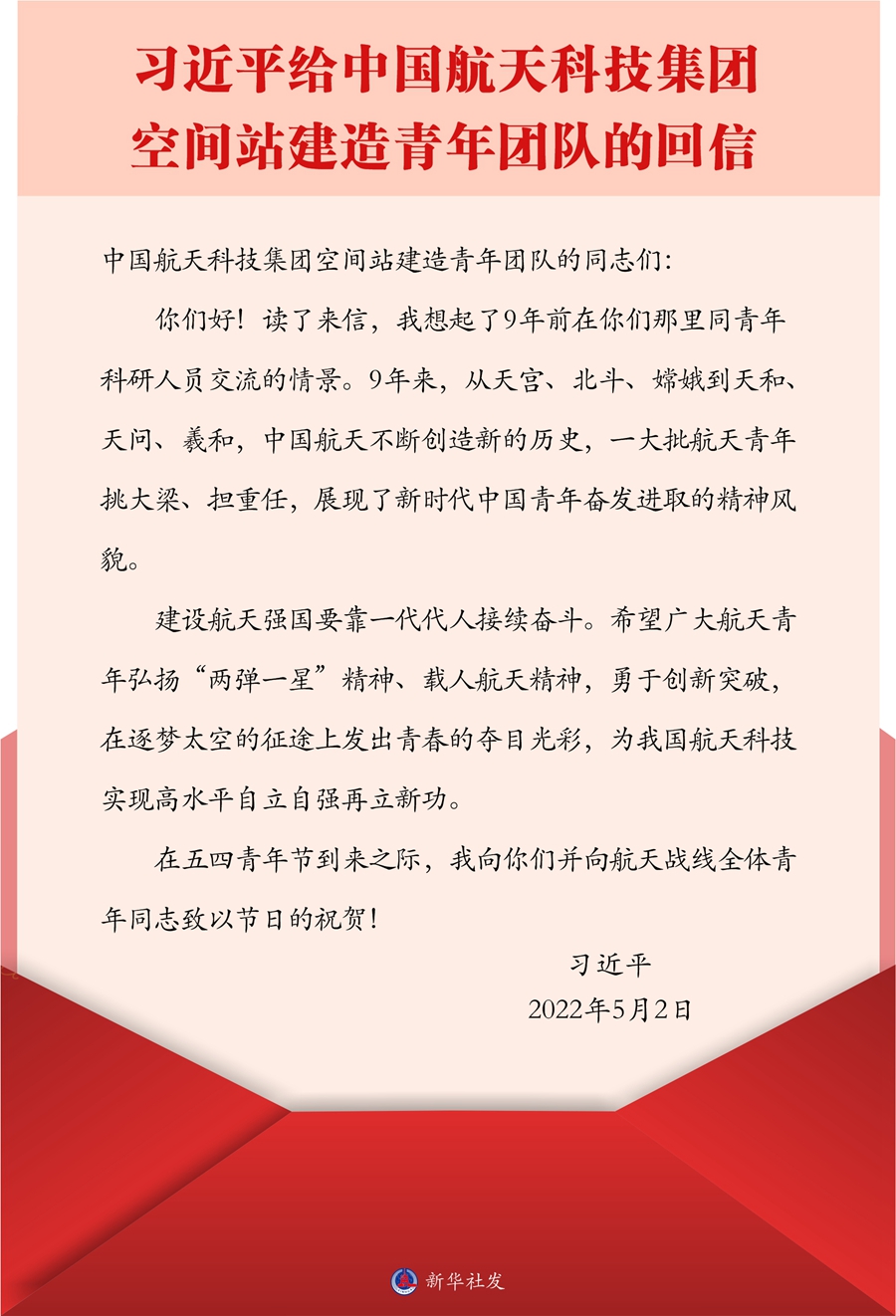 在五四青年节到来之际,中共中央总书记、国家主席、中央军委主席习近平5月2日给中国航天科技集团空间站建造青年团队回信,向航天战线全体青年致以节日的祝贺,并向他们提出殷切期望。
