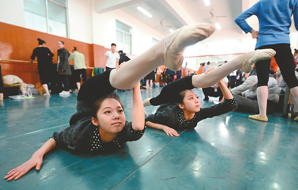 双胞胎姐妹刘静雯(左)和刘静茹同场参加舞蹈专业的考试