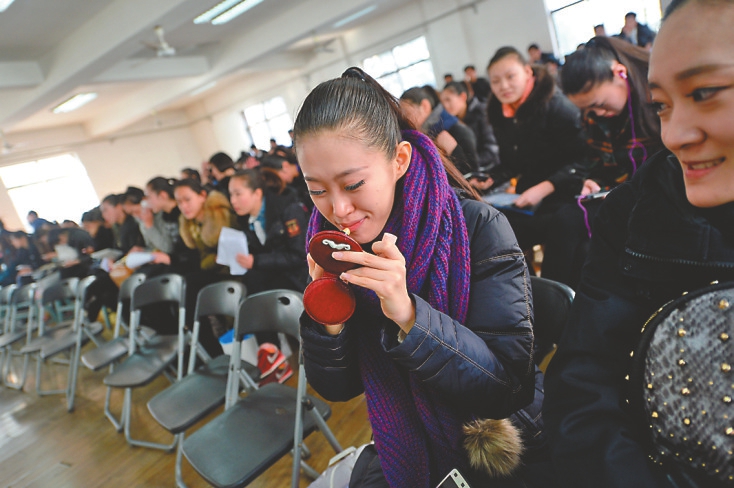 本版照片均由记者王锋 摄考生表演走秀考生候考期间补妆