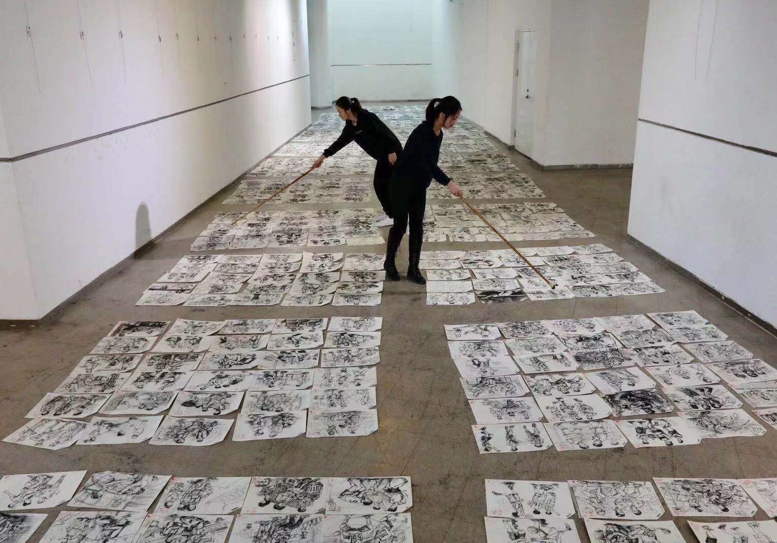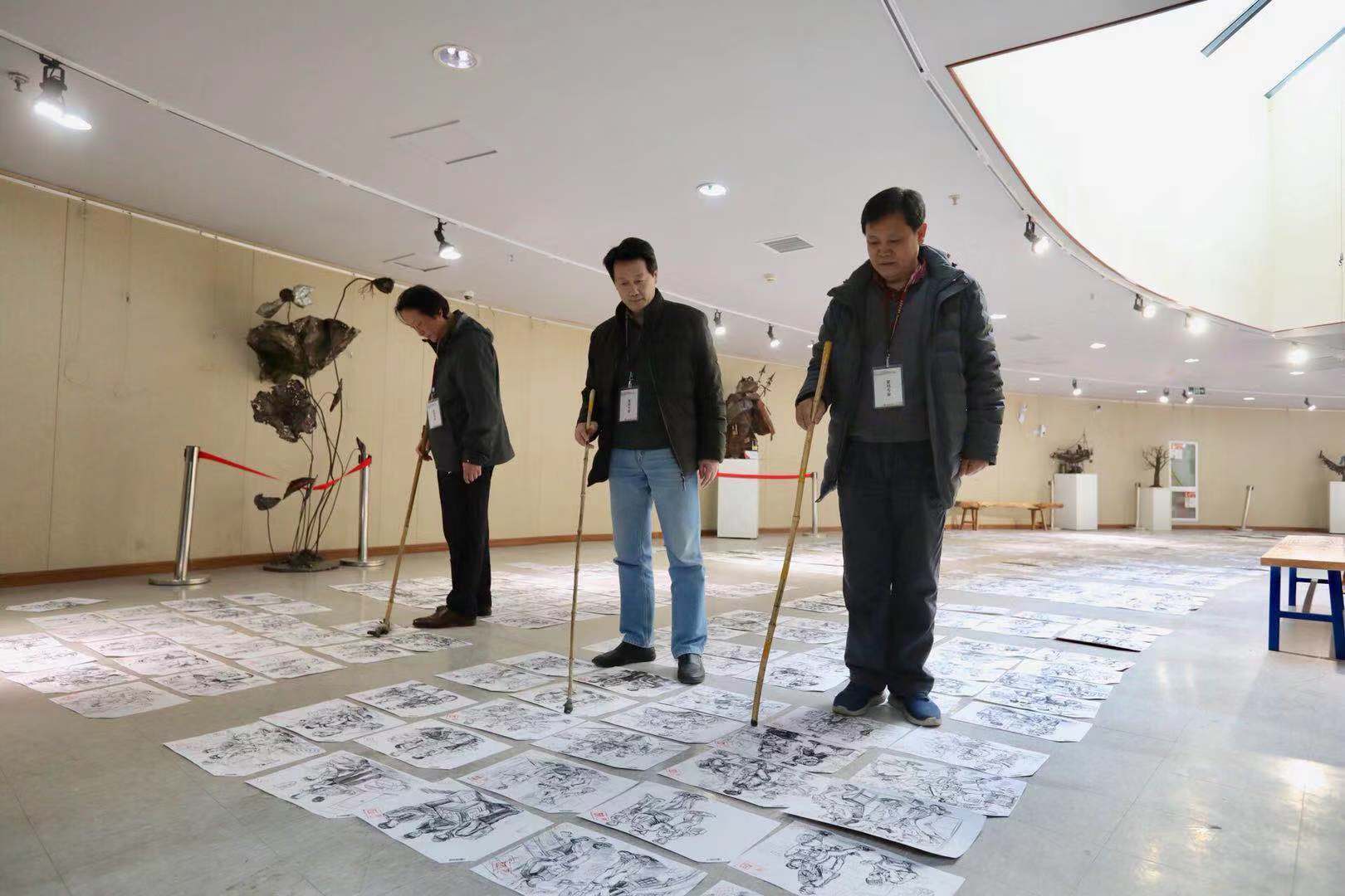 2月28日,记者在山艺长清校区图书馆看到,走廊地面上摊铺着成片的美术类考生作品,评卷专家人手一根长竹竿,对考卷位置进行调整,有时同组专家还会凑在一起分析探讨一幅画作。