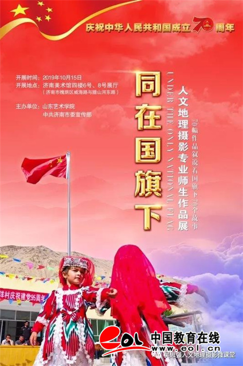 中国教育在线讯 10月15日,为庆祝中华人民共和国成立七十周年,由山东艺术学院、中共济南市委宣传部共同主办的“同在国旗下——人文地理摄影专业师生作品展”在济南市美术馆开展。山东省文联党组书记、副主席王世农,济南市委宣传部常务副部长周鸿雁,山东艺术学院党委书记马东骅,齐鲁师范学院原党委书记刘步俊,山东大学原党委副书记方宏建,山东省海洋与渔业执法总队总队长辛荣民,山东广播电视台原副台长、山东省美协当代艺术委员会主任潘士强,大众日报报业集团副总编辑魏武,中国渔业报社社长汪文,中国摄影报副总编辑柴选,山东画报社原总编辑王立,台湾指传媒社社长游胜钧,台湾人民报社社长巫月桦,山东师范大学党委统战部部长隋文慧,山东省海洋与渔业执法总队办公室主任刘东璞,济南市委宣传部文艺处处长支景阳,山东文化产业国际商会秘书长、画家泥土,山东省当代艺术创作院院长孙惠福,济南市美术馆、济南画院书记刘玉亮,济南市美术馆副馆长、济南画院副院长徐琳,法国巴黎第八大学教授、博士生导师、摄影系创始人、原摄影系主任Christian Mayaud (克里斯蒂安·梅耶)等领导、嘉宾和艺术家们与山东艺术学院党办院办、学生处、设计学院、国际艺术交流学院负责人及来自设计学院、传媒学院、电影学院师生代表等参观展览。