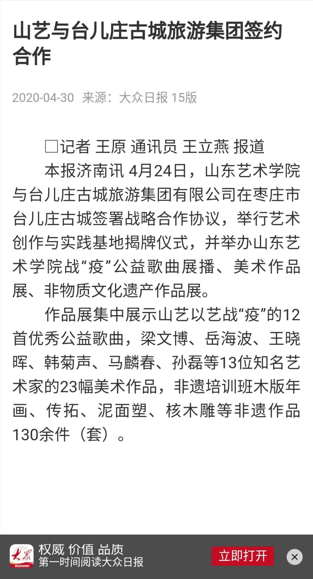 【大众日报】山艺与台儿庄古城旅游集团签约合作