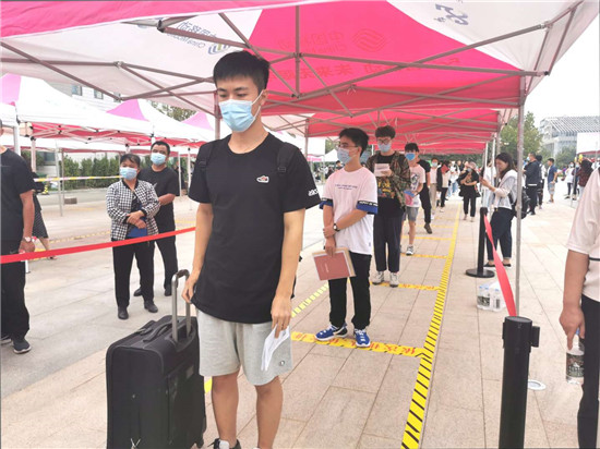 早上8点左右,记者在学校长清校区校门口看到,已有不少来送新生报到的私家车陆续排队进入学校。在进入学校前,新生须出示入学通知书、微信或支付宝健康码(山东电子健康通行卡),并检测体温。