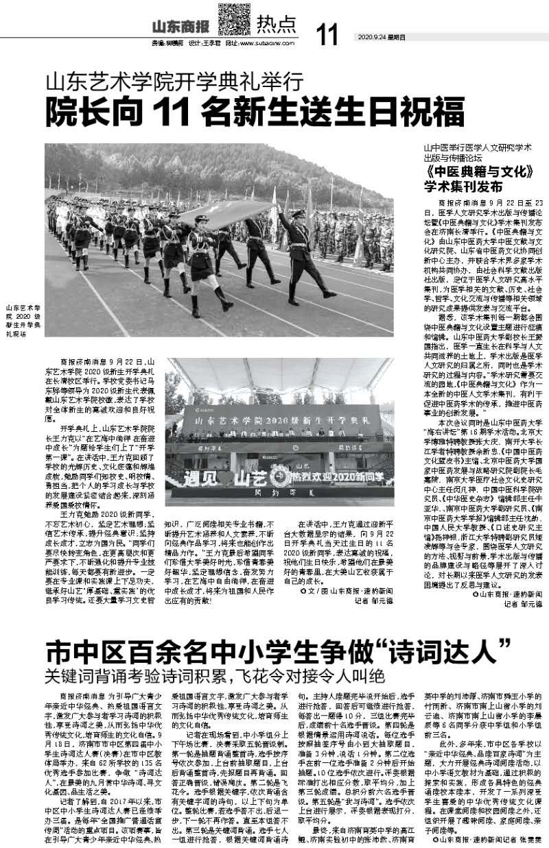 【山东商报】山东艺术学院开学典礼举行 院长向11名新生送生日祝福