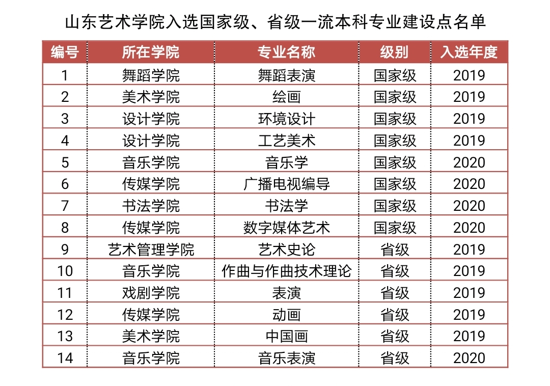 近日,《教育部办公厅关于公布2020年度国家级和省级一流本科专业建设点名单的通知》(教高厅函[2021]7号)印发,正式公布了 2020年度国家级和省级一流本科专业建设点名单。山东艺术学院5个专业获批国家级、省级一流本科专业建设点。其中音乐学、广播电视编导、书法学、数字媒体艺术等4个专业获批国家级一流本科专业建设点,音乐表演专业获批省级一流本科专业建设点。目前学校拥有国家级一流本科专业建设点8个,省级一流本科专业建设点6个,省级及以上一流本科专业占招生专业比例达45%。