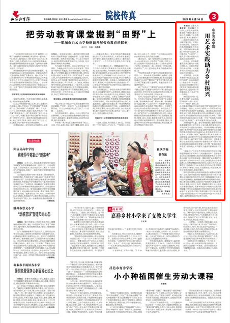 为帮扶留守儿童,音乐学院教授王歌群在郓城县唐庙镇刘垓小学为学生上音乐课,普及音乐知识,并受郎朗艺术基金会的委托,向该校捐赠一架智能钢琴;美术学院“寻红色足迹、画时代新貌”社会实践团把美术用品和亲手绘制的89张书签送到乡村学生手中,并且精心准备了趣味美术课;美术学院“永远跟党走、奋进新时代”社会实践团走进滕州市后杨岗村为留守儿童开展了为期一周的书法、创意美术等公益支教活动;戏剧学院“推普助力乡村振兴”社会实践团赴高唐县新华希望小学开展“普通话诵百年党史”专场演出,并与留守儿童进行普通话学习互动。