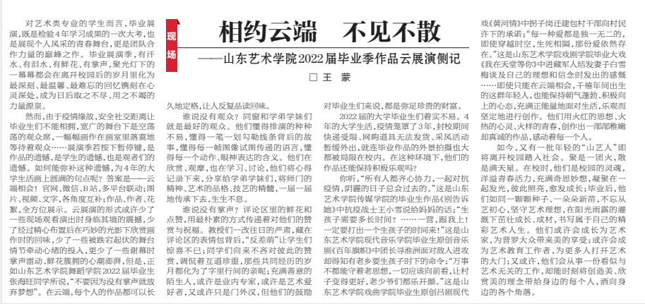 然而,由于疫情缘故,安全社交距离让毕业生们不能相拥,宽广的舞台下是空荡荡的观众席,一幅幅画作在画室里落寞地等待着观众……展演季若按下暂停键,是作品的遗憾,是学生的遗憾,也是观者们的遗憾。如何能弥补这种遗憾,为4年的大学生活画上圆满的句点呢?答案是——云端相会!官网、微信、 B站,多平台联动;图片、视频、文字,各角度互补;作品、作者、花絮,全方位展示。云展演的形式或许少了一些现场观看演出时身临其境的震撼,少了经过精心布置后在巧妙的光影下欣赏画作时的回味,少了一些被跌宕起伏的舞台情节牵动心绪的投入,更少了一些谢幕时掌声雷动、鲜花簇拥的心潮澎湃,但是,正如山东艺术学院舞蹈学院2022届毕业生张海旺同学所说,“不要因为没有掌声就放弃梦想”。在云端,每个人的作品都可以长久地定格,让人反复品读回味。