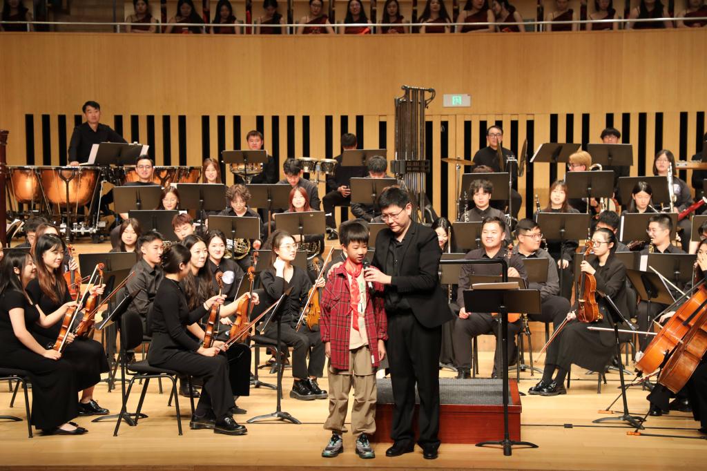 活动现场随机邀请了多名中小学生上台沉浸式体验乐队现场演出和临场指挥
