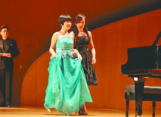 王秋懿在工作人员的帮助下走上省会大剧院音乐厅的舞台