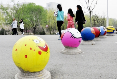 28日,山东艺术学院的学生用水粉在全校30余个球体石墩上绘制了各种卡通图案,给冰冷的石墩赋予亮丽的外表。