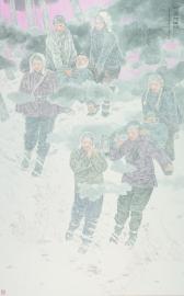 今天的重要任务就是在落墨大画之前,画一个色彩稿子,因为这是必须的。它可以帮助我严格控制画面墨色的明度。我尽量把人物控制在一个中性的紫灰调子里,找到她们之间色彩微差,做到既和谐统一,又不失每个人的个性。其实在草稿设计时,对每个人的性格、动态、服饰都做了许多的匠心,在色彩设计上也必须与每个人的性格特征相符……联想一个雪景的山坡,有被战火摧残的树木。彩色稿在不断地完善中进行。
