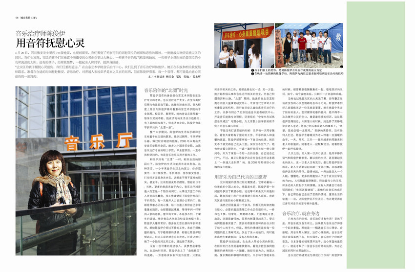 不是没有打退堂鼓的时候!几乎每一次同学聚会,看到大家都有了固定的工作、不菲的收入和温馨的家庭,陈俊伊都要审视一下自己的处境,然后免不了就觉得自己灰头土脸。实在沉不住气了,她也曾去看心理医生,一遍一遍仔细回答每一份心理问卷,只为了拿到一个好一点的分数,自己给自己打气。不过,真正让陈俊伊决定在音乐治疗这条路上“一条道儿走到黑”的,是2008年那场惊心动魄的汶川地震。