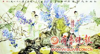 此外,梁文博、王小晖以紫藤、仕女为题,创作出一幅精彩作品。只见画面中紫藤笼于镂空奇石之上,三位仕女或端望或横笛,着红绿带裳现于花间,线条优美,意蕴清新。两位皆是有着深厚工笔基础的艺术家,所以合作起来十分默契,在色彩的运用上,更是处处留意,小心斟酌。梁文博画紫藤时长线飘逸与短线交叉相组合,王小晖画仕女正染衣色,反填肤色,更显清润可人。结尾梁文博之添“竹雨、秋风、琴韵、茶烟、梧月、书声”之题拔,立刻烘托出整幅画面的气氛。