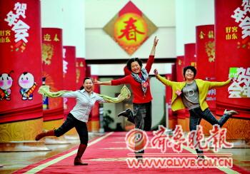 22日下午,参加完分组讨论后,省政协文艺界委员李瑞华(左)、王晓晖(中)、杜华(右)在山东大厦长廊里即兴跳起了民族舞。