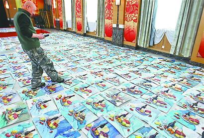 11日下午,记者在山艺工作人员的带领下,来到市区一宾馆内,这里的7层大厅是山艺彩画的阅卷点,地上铺满了考生的作品,5位阅卷老师正手持一个类似“大哥大”的电子打分器对作品进行打分。记者注意到,每一幅作品上都盖了“档章”,上面是该作品所处的档次,5位阅卷老师会根据档内的分值进行打分,然后取平均值作为该作品的得分。记者看到,每幅作品上都没有考生的姓名,但卷子的左上角有一个条形码,这就是考生暂时的“身份”了。“彩画主要看画面的色、形、质,就是色彩的变化,物品的形状和给人的质感。”一位现场阅卷老师说。
