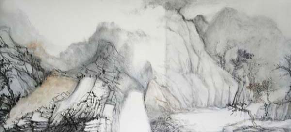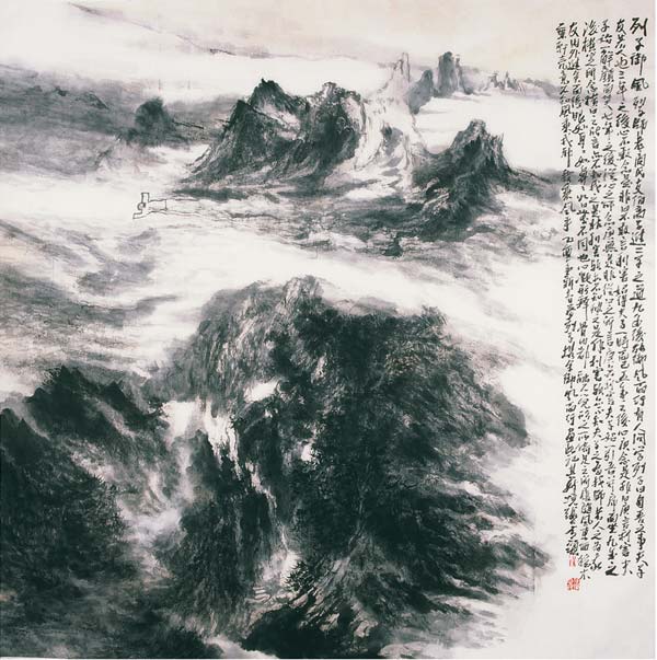 在我看来,张志民的精神境界具有双重结构层面,一者为显现层面;一者则为潜在层面。就显现层面来看,张志民大约是思接老庄,返心于玄远之境。对此不少评论家均有论涉。应该说,所谓玄远之境,在先秦哲人那里(如老庄)往往是究诘于天地万物之“本体”。这种境界虽然始于万物,但却步步提升。超越,从而由万物而天地,继由天地而通宇宙直到“本体”。先秦哲人往往将这个“本体”称之为“道”。道(“本体”)与万物,是创造与被创的关系,所以“道”是根源,是万物之“母”。相对“物”而言,“道”(“本体”)是无限、无规定的,所以老子说“大道汜兮,其可左右”。所以庄子说:道是“泛泛乎其若四方之无穷,其无所畛域”。相对“物”而言,“道”(“本体”)不仅是无限的,而且还是无形的,所谓“大象无形”,“无状之状,无物之象”,所谓“视之无形,听之无声”、“窈窈冥冥”、“昏昏然然”,如此等等。我想,张志民对于这种境界是有着深刻体悟的,并且是一种画家自由的胸襟去洞悉之、把握之——作为画家,张志民当然要师法造化,观物取象,从而从笔锋下决出自然山川。这也就是说,从自然(“造化”、“万物”)出发,是他绘画创造的无可怀疑的一个基点。但不妨说,他还拥有一个更高的、超迈的审美基点——这就是“道”即所谓“本体”境界。有了这样一个基点、境界,面对天地万物,张志民就自然会获得一种新的艺术视野。不拘于具体的物象、不流连于自然的有限形态,不停滞于一草一木,一石一水的物理表层,而是力求突破形象,真宰上诉,取摄本源,从而使之与道合一。应当说,中国古代画家也深谙此理,所以传统山水画往往于自然和谐之中透发出一种虚旷的风致。但张志民的山水却并不尽然如此。我们看到,由先秦哲学家人所提示而出的“本体”(“道”)境界赋予了他的山水作品具有一种内在张力——另一方面,他要描绘具体的山水物象,他的笔墨语言要围绕着自然形态进行生发、构造;人们只要留心细辨,即可发现张志民的山水情态总是蓄藏着勃勃欲出的意向。其笔锋中似乎裹挟着一种激越的、超脱不羁而难以掩抑的气脉,那些山川丘壑在恣肆如狂的笔墨节律中仿佛溢出画外,直入玄冥之地。可以说正是这两个方面使他的作品总是涌动着内在张力,当这种张力不能达到一种消解平息时,就会给人们的视觉带来很强的紧张感和冲击力。我们看到,张志民还画了不少以“入境”为题的山水作品,在这些作品中,画家力求将他整个身心,连同笔墨形态,以及笔墨所表现的自然物象一同归依于大化无形之境域。这一类作品——依我所见,只能算是一半成功的。当他刻意去追求“入境”之主题——这种主题越是明确了然,往往却离他越远,渺不可及。相反,当主题趋于模糊而以纯然的山川形象展现之际,却在不期然而然之间,有一种惚恍幽玄之境从中自然映现、敞开……在这里,那种激越的笔调为一种如诉如吟的、平缓的叙述形式所替换。那山形宛转之中的云气流通,那不辨形模的树木穿插,那似泉似溪、似烟似霭之缭绕,似乎都在默示着天地无言之美。由于画家心悬于本体之境,所以下笔所绘的物象往往出没于有形而无之间。或者说,一切具体的,有形的自然事物在本体(“道”)之境的映射下顿呈晶莹剔透之象。如果说,前一类具有内在张力的山水作品乃是“气质俱盛”的话,那么后一类作品则可以说是通达物象之“源”(“道”)了。