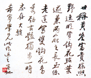 上世纪三十年代于老在上海求学时,曾画过八幅工笔花鸟册页,请宾虹先生指教。黄宾虹看后十分高兴,欣为题写了“世称黄筌富贵,徐熙野逸,明贤钩花点叶,遂兼两家之长,至陈老莲写双钩花鸟,秀劲古艳,独步一时,志存大雅,希宁学兄此作近之。”对一个二十几岁的艺术学子,给予了极大的肯定和鼓励。
