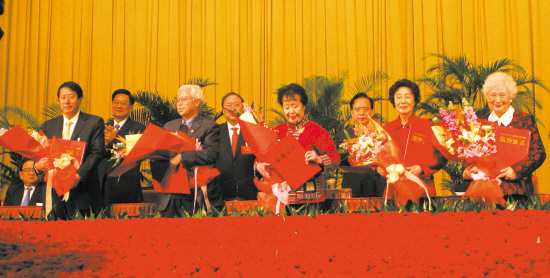 老艺术家及其代表上台领奖。从左到右依次为:柳文敏(代于希宁领奖)、冯德英、郎咸芬、王玉梅、张春秋。 记者 王晓峰 摄
