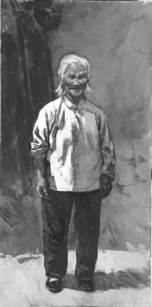 历史题材的创作必须真实地表现特定的环境和特定的人物,写实油画历来是表现重大题材的先锋,纵观美术史主题创作的杰作,无一不将油画语言这一独特的艺术魅力发挥到极致,这些作品所展现的总体布局、造型的准确和色彩的渲染之美,艺术地再现了特定的情境。在这次“沂蒙六姐妹”造像创作中,以油画的形式完成老年的形象,其特点重在写实,六位老人饱经沧桑的面容跃然画面,既亲切又真实。写实油画的根基是建立在“自然”基础上的,同时又和这种“自然”有着巨大的差别,其表现出来的结果完全不同,它将每个人一生的魅力与精彩展示在瞬间,塑造张玉梅老人半挽袖子的形象,体现了当年蒙阴烟庄村村长的雷厉风行与干练;伊淑英老人在六姐妹中形象高大,在造像中把她置身于蓝天白云蒙山沂水之间,所展现的是沂蒙的敦厚与质朴,印证了陈毅元帅说过的她们用小米供养了革命。