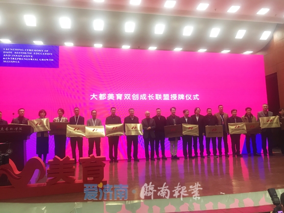 靳尚谊教授、山东省文化和旅游厅副厅长张桂林,山东省教育厅学生就业创业教育咨询中心主任李春光,山东艺术学院校长王力克,大都文化传播有限公司董事长罗利君、副董事长王韫真,向各高校授牌。同时,山东省16家联盟成员高校,在大都文化传播有限公司挂牌“大学生双创实践基地”。