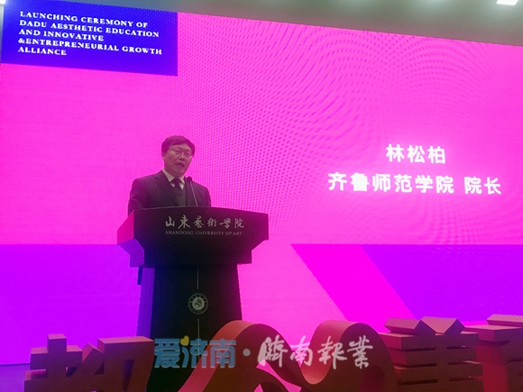 齐鲁师范学院校长林松柏作为高校领导上台发言。他表示,齐鲁师范学院始终坚持“育人为本、德育为先”的办学理念,高度重视美育双创教育,齐抓共管,多措并举,在长期的办学实践中形成了以美育美的传统和美育英才的环境。齐鲁师范学院希望与在座各位携手并进,将致力于追求联盟“创建校企创新创业美育实训平台,助力企业核心能力转型升级,共筑智慧时代创新人才高地”的目标,以更加开阔的视野,更加务实的精神,更加昂扬的姿态,励精图治,乘势而上,努力推动美育双创事业发展再上新的台阶,为山东美育双创教育事业的发展做出新的贡献。
