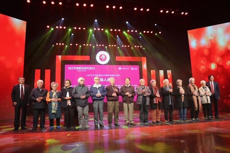 山东艺术学院党委书记马东骅、院长王力克为学校80岁以上的老教师、老职工代表颁发“山东艺术学院建校60周年荣誉纪念奖”,学生代表向获奖教职工代表献花。