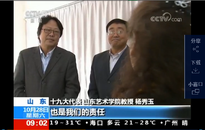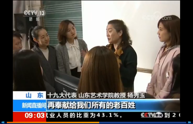 在山东艺术学院的课堂上,十九大代表杨秀玉教授通过生动的讲解,把自己现场听报告的幸福感、获得感,把党对青年寄予的厚望传递给自己的学生。(视频1分42秒处开始)